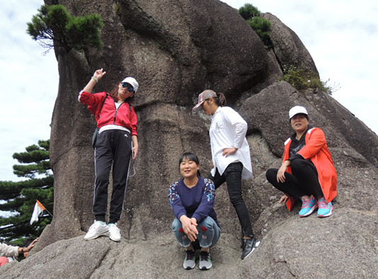 在下索道后,隊伍所有人立即被眼前美景所吸引,迫不及待掏出相機、手機互相攝影留念。在經(jīng)過(guò)短暫的停留與整頓后,旅行隊繼續前行,徒步經(jīng)蓮花峰、天都峰,以及“蓬萊三島”、“百步云梯”、“一線(xiàn)天”、“新一線(xiàn)天”、“鰲魚(yú)洞”等諸多景觀(guān),歷時(shí)三個(gè)多小時(shí)攀爬,隊員們的體力基本已消耗殆盡,甚至個(gè)別隊員的腿部肌肉因疲勞酸痛而不由自主地發(fā)抖,然而在這種情形下,沒(méi)有金太陽(yáng)人肯輕言放棄,只因心中還有目標,大家相互攙扶,彼此鼓勵著(zhù)繼續前進(jìn),終于登上了海拔1841米的黃山玉屏景區的第一高峰——光明頂。