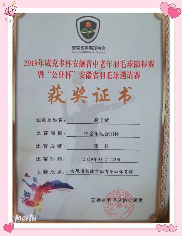 日前,從安徽省羽毛球協(xié)會(huì )傳來(lái)喜訊,我公司職工高文斌榮獲2019年“威克多杯”安徽省中老年羽毛球錦標賽暨全省“公仆杯”羽毛球邀請賽中,奮力拼搏,奪得“中老年混合團體第一名”桂冠。