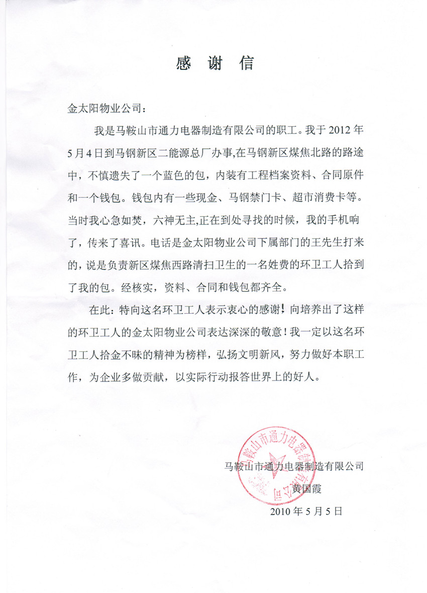 金太陽(yáng)物業(yè)公司環(huán)衛工人拾金不昧,失主特發(fā)來(lái)感謝信!